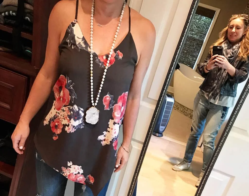 Well, we had a new client a few weeks ago and, we always try and shop a client’s closet BEFORE we ever hit a store – and this is why!! While going through her closet we found a very, very short dress. The color, pattern, and condition of the dress were great – it was just super-duper short. So, we decided to give it a new life. With our vision, and some alteration, we had the dress turned into a cami. Which, btw, is very “in” right now