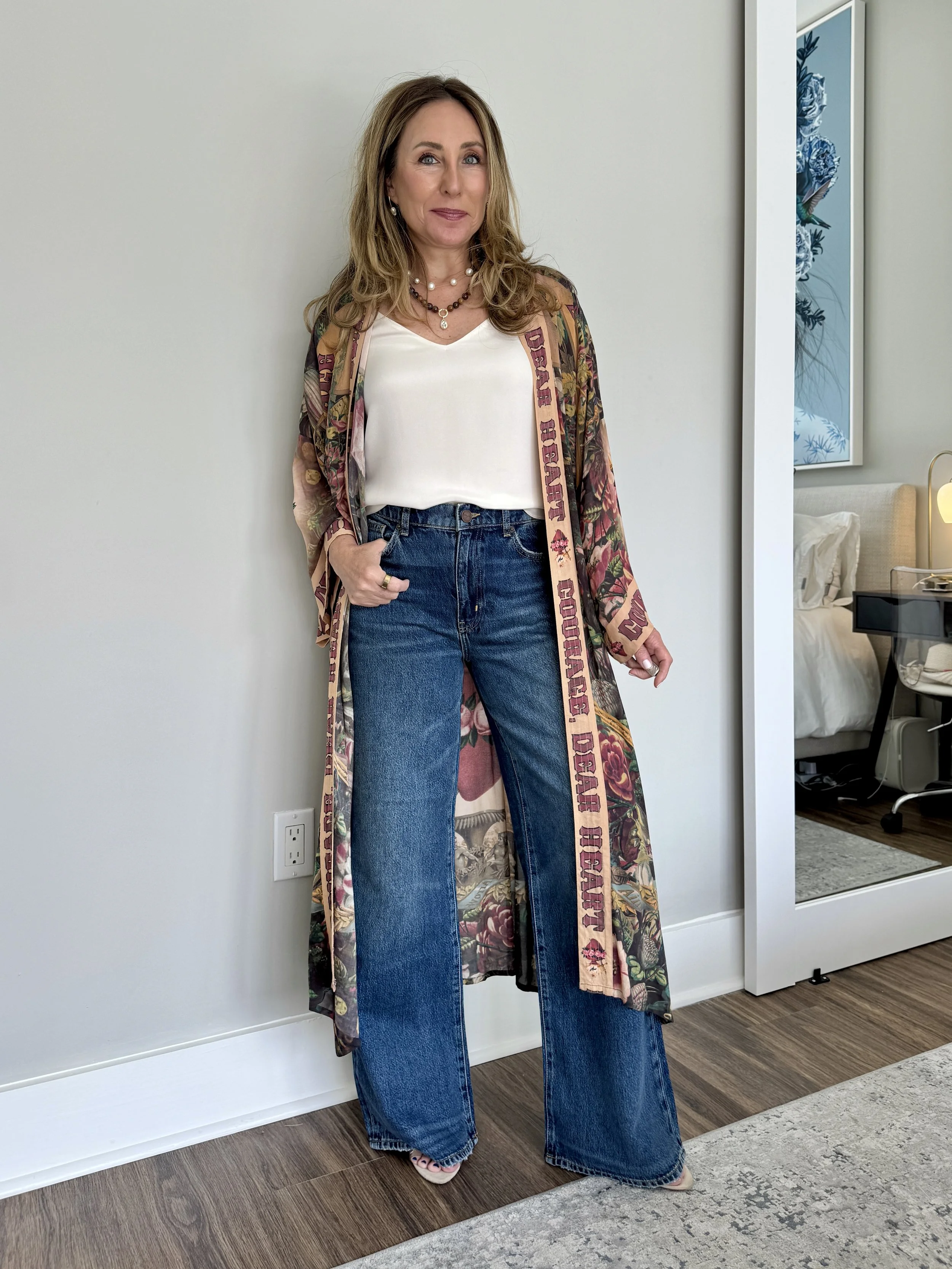 And here’s the thing about dusters: they don’t have to be actual dusters. A shirt dress worn open works beautifully. A lightweight robe-style jacket? Gorgeous. I have one that was technically meant to be a robe, but I don’t always like to keep things as they are so I repurposed it as a topper and it looks incredible. Don’t be afraid to think outside the box with what’s already in your closet.