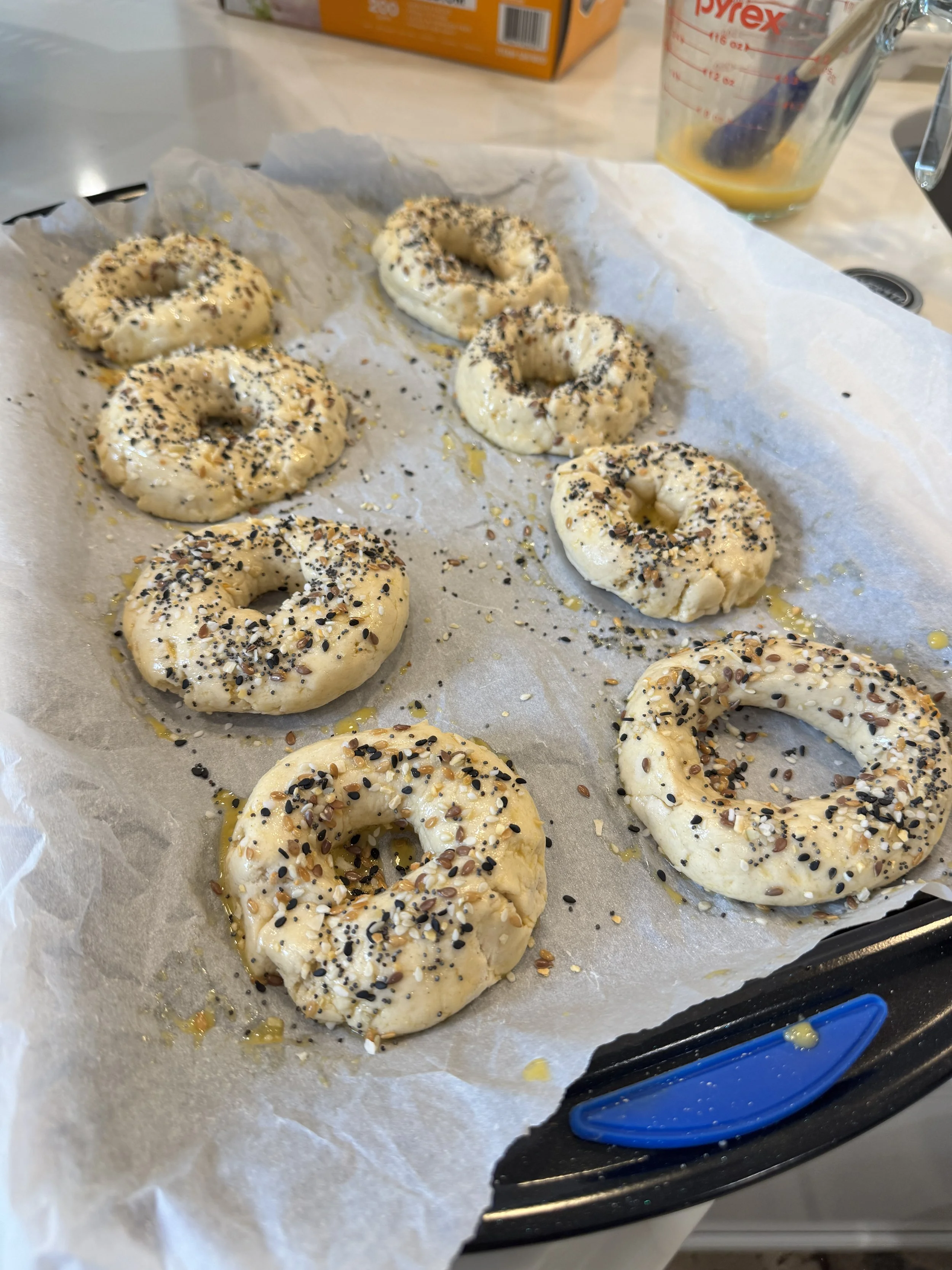 Add toppings: Brush each bagel with the beaten egg and sprinkle generously with everything bagel seasoning.