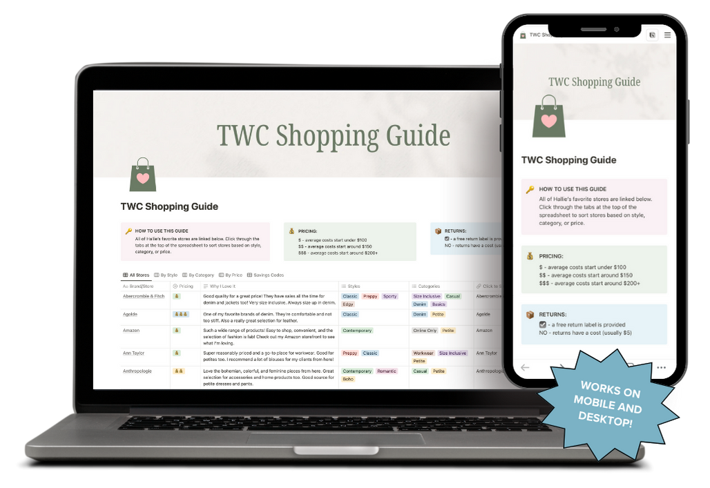 Unlock your style potential with my interactive Shopping Guide! This comprehensive resource features over 300 hand-picked stores, organized by style (classic, boho, sporty, etc.), category (basics, workwear, shoes, size inclusive, etc.), and price point.